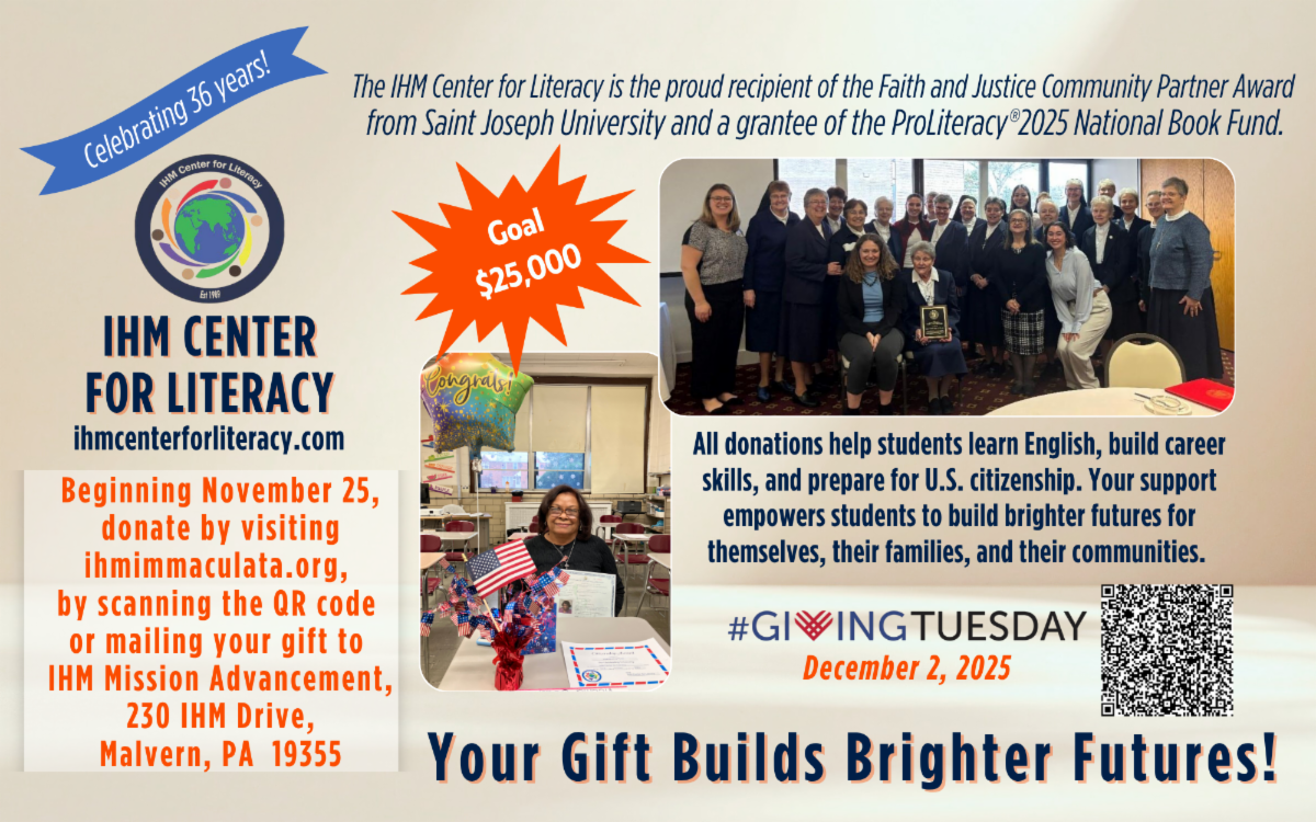| | Thank you to everyone who made a donation on GivingTuesday in support of the award-winning IHM Center for Literacy in Philadelphia. Your gift will truly change lives and help bring hope to those who need it most, especially during this holiday time! | | On Thursday, December 11th, the sisters and staff at Villa Maria House of Studies gathered together to celebrate the upcoming nuptials of Mission Advancement Coordinator, Dan O'Neill. We wish Dan and his new bride nothing but the best of luck in their new life. May God shine his grace upon this beautiful couple. | | Pictured left to right: Sister Bernadette Chuk, Maureen Cislo, Dan O'Neill, Sister Monica Sicilia, and Sister Regina Plunkett | | | | | |