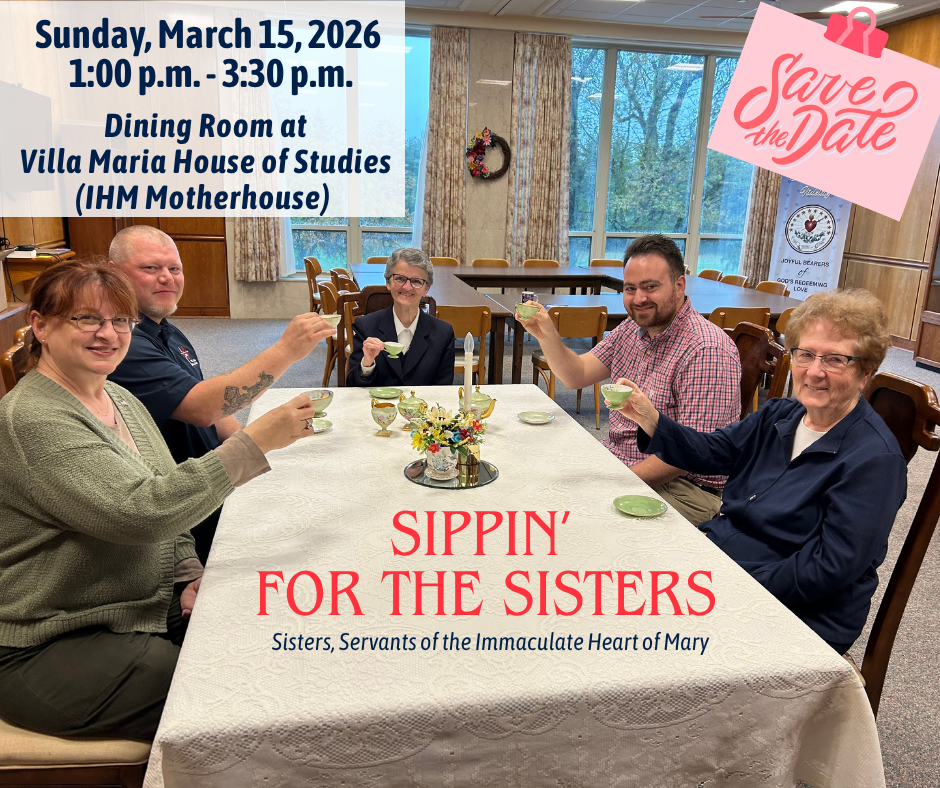 Mark your calendars for the 2026 Sippin' for the Sisters Tea Fundraiser to benefit Camilla Hall on Sunday, March 15, 2026 from 1:00 p.m. - 3:30 p.m. This year, we have a new venue! Join us in the Dining Room at Villa Maria House of Studies (the IHM Motherhouse at 1 Our Lady Circle, Malvern). As always, there will be specialty teas, a variety of tea sandwiches, delectable desserts, and raffles. Our new venue provides guests with the opportunity to visit Sacred Heart Chapel and tour our Heritage Room highlighting the IHM Congregation's rich history. This year we are raising money for electrical beds and recliners for our Camilla sisters' comfort.
