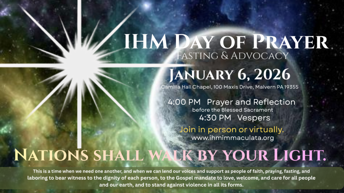 The Sisters, Servants of the Immaculate Heart of Mary are inviting our partners in ministry, colleagues, and friends to join us for an IHM Day of Prayer, Fasting, and Advocacy. Many of us feel a desire to respond to the ever-increasing division with a call to love, guided by hearts of contemplation and action. January 6, 2026, our annual IHM Day of Prayer, sisters and lay partners are invited to join with us in person or virtually for Evening Prayer at Camilla Hall, 100 Maxis Drive, Malvern, PA 19345. The prayer time will begin with a prelude of prayer and reflection before the Blessed Sacrament at 4:00 p.m. and Communal Vespers at 4:30 p.m. Please join us in person or virtually. The live stream link will be posted at www.ihmimmaculata.org and at the Camilla Hall YouTube page.