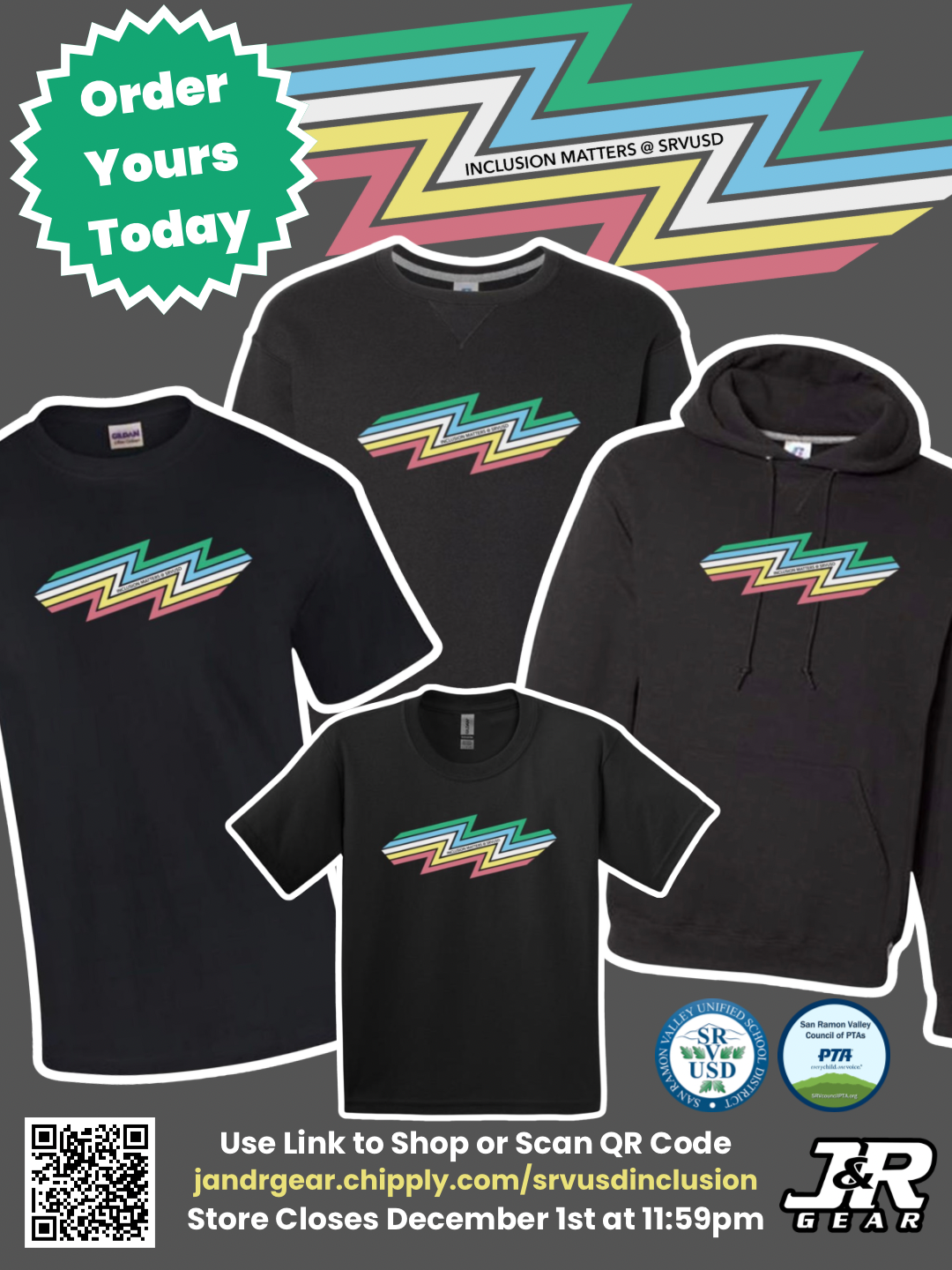 Hoodies, sweatshirts and t-shirts are now available for preorder and will be delivered to your school site before SRVUSD Inclusive Schools Week in January 2026.