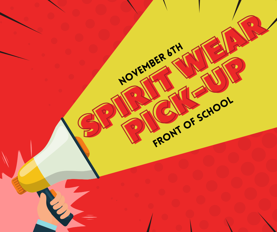 Good news! Spirit Wear orders have arrived! Students can pick up their Spirit Wear after school on Thursday, November 6, from 2:45–3:45 p.m.