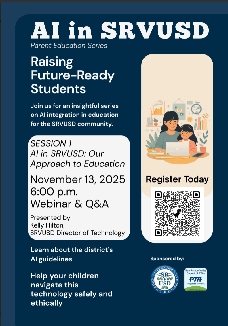 Join us for the first session of the SRVUSD AI Parent Education Series, "Raising Future-Ready Students". This series is designed to help San Ramon Valley Unified School District (SRVUSD) parents and guardians understand the role of artificial intelligence in their children’s education. Our goal is to explain how SRVUSD approaches integrating AI into education. We will highlight the district's guidelines and empower you to help your children navigate this technology safely and ethically.