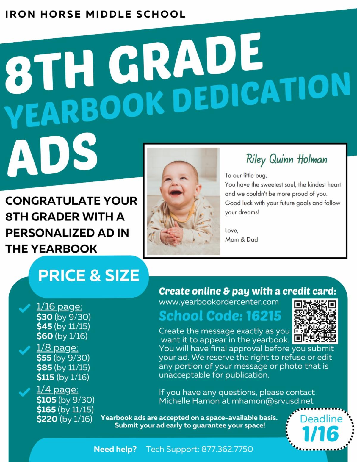 Congratulate your 8th grader with a personalized ad in the yearbook!