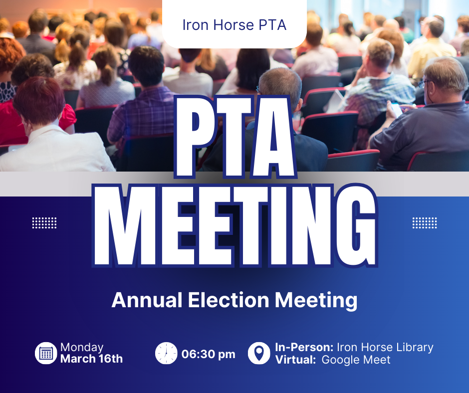 Join us for our next PTA meeting, including our annual election, on Monday, March 16, 2026 at 6:30 p.m. in the Iron Horse Library and on Google Meet: https://meet.google.com/nku-oqpt-hut.