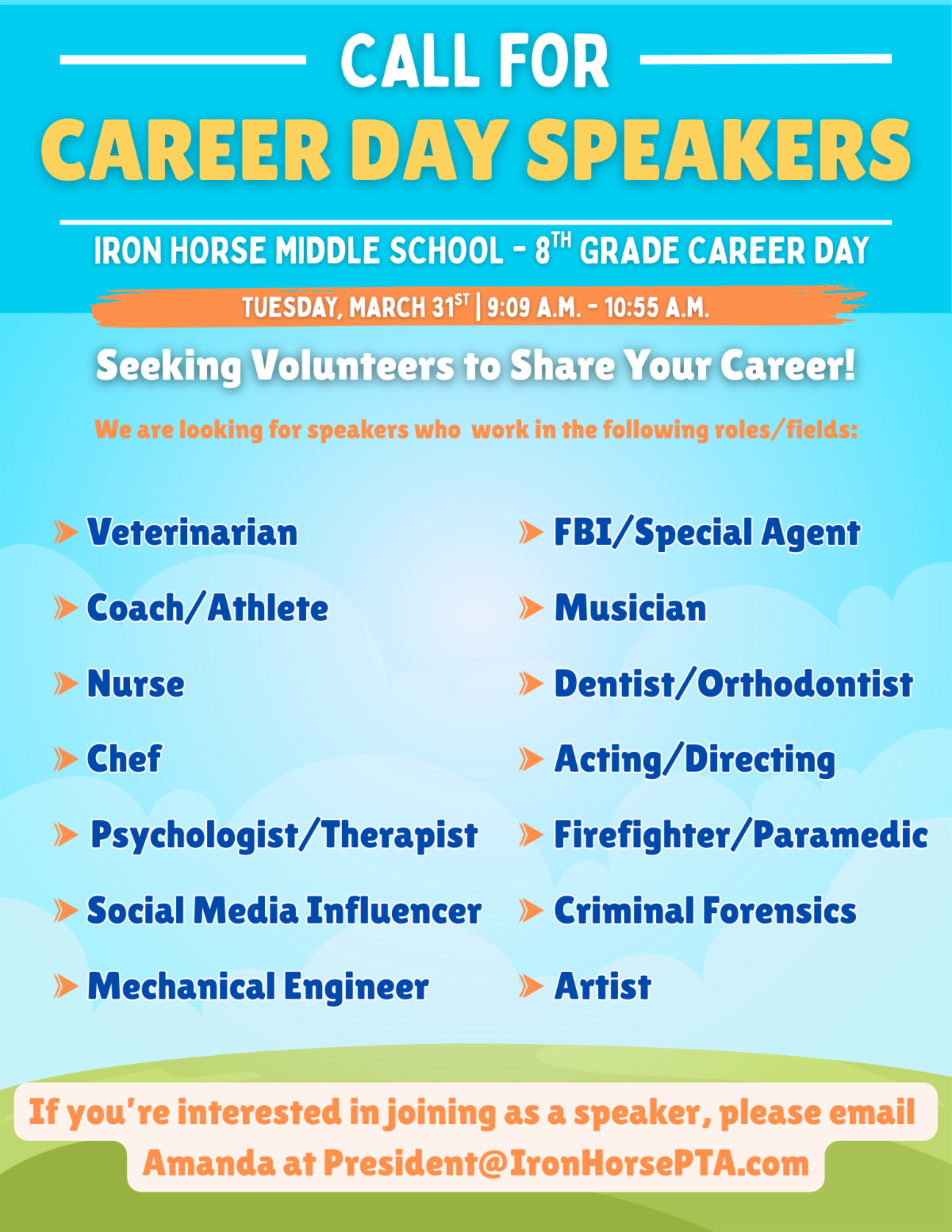 We’re looking for community members willing to speak with small groups of 8th grade students about their career path and real-world experiences. Students have expressed interest in the listed positions.