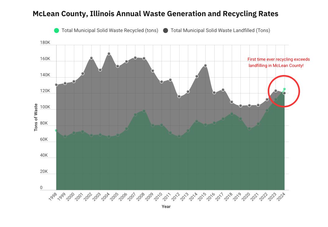 That’s right, you read that correctly! For the first time, since the Ecology Action Center began collecting waste generation and recycling data, McLean County’s recycling rate is over 50%. That means of all the waste generated within the county, more than half of it was recycled in 2024. This is big milestone for them and also one of the major goals in their solid waste management plan.