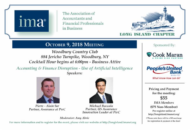 Fall is here and The IMA is in full swing to meet your educational and networking needs. We are updating our records and need your help. Please update your IMA profile (once at the global IMA webpage, click on "myIMA" then "myProfile" to update your contact information)to continue to receive important IMA information from your Long Island Chapter. As a member or non-member, please sign up here to receive the Long Island Chapter Newsletter . We hope you enjoy our new communications to you and I hope to see you at our next dinner meeting, October 9th, discussing Accounting & Finance Disruption - Use of Artificial Intelligence, being presented by leaders from PwC.