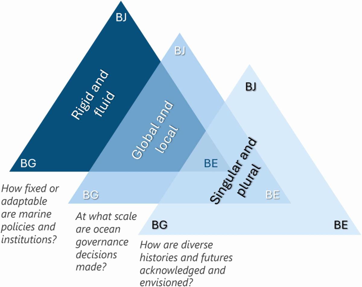| | Figure 7. Visualizing the interplay of the three analytical lenses: rigid and fluid, global and local, and singular and plural alongside illustrative questions. BJ = Blue Justice; BE = Blue Economy; BG = Blue Governance. | |