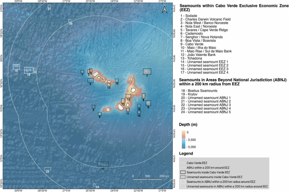 | Figure 2. Seamounts within the Exclusive Economic Zone (EEZ) of Cabo Verde (solid white line) and in the surrounding Area Beyond National Jurisdiction (ABNJ) (dashed white line). The seamounts in dashed lines correspond to unnamed seamounts, identified in Yesson et al., (2021). Officially recognized seamounts refer to seamounts bearing an official name. Seamounts in the ABNJ have been depicted in the map but not included in this review. (Bathymetry data source: Global Multi-Resolution Topography (GMRT), 2024; Ryan et al., 2009; Kwasnitschka et al., 2024) | |