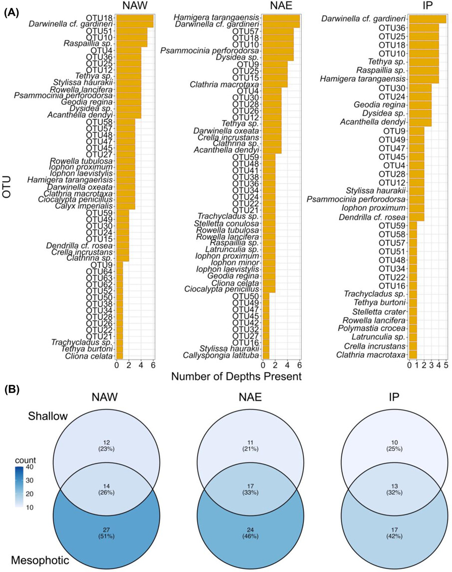 | | Figure 6. (A) Percentage of sponge OTUs present in only mesophotic depths, only shallow depths, and both zones, at all three sites (NAW = Northern Arch West, NAE = Northern Arch East, IP = Imagination Point), and (B) list of sponge OTUs and the number of depths in which they were present at all sampling sites (NAW = Northern Arch West, NAE = Northern Arch East, IP = Imagination Point). Sponges which were not present at each site are not included. | |