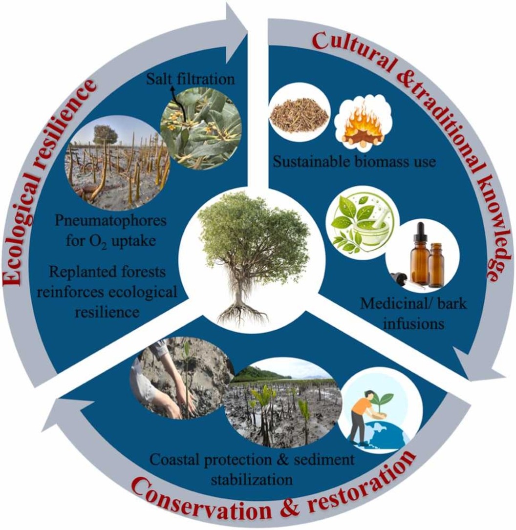 The gray mangrove (Avicennia marina) is integral to coastal life in the arid Arab region. It can thrive in extreme conditions such as high salinity, scorching temperatures, and drought. As a result, it supports a rich web of marine and terrestrial species and offers a natural shield against coastal erosion and storm surges. Its intricate root systems stabilize shorelines and help protect the coastal areas from the impacts of rising sea levels. In addition, A. marina is deeply linked to the culture of the local people. Local communities have relied on its wood for fuel and construction for generations. Moreover, the gray mangrove is considered a symbol of resilience in regions with scarce resources demonstrating the enduring strength and adaptability of those who have coexisted with it for centuries. Currently, traditional knowledge about sustainable harvesting and conservation remains crucial for the survival of A. marina. Rapid urbanization, pollution, overharvesting, and climate change affects mangrove habitats. Despite these challenges, a combination of local stewardship and policy-driven conservation efforts has helped maintain A. marina populations in many parts of the Arab world. Research has also documented various phytochemicals in the species with promising health benefits including antimicrobial, anti-inflammatory, and anticancer activities. Balancing these biomedical opportunities with sustainable conservation practices will ensure that A. marina continues to thrive as a cornerstone of both environmental health and cultural heritage.