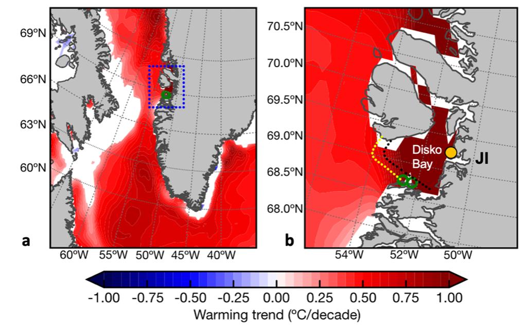 | Figure 5. West Greenland surface water temperature warming trend. a) Temperature trends (°C/decade) for the period 1982-2020 for summer sea surface temperature (SST, JJA, OISSTv2p1; 0.25x0.25° resolution, 1982-2020) for oceanic regions offshore of (a) southern and (b) central-western Greenland. b) Disko Bay region in central-western Greenland (rectangle, enlarged in a) with locations of sampling sites (green circles) southwest of Jakobshavn Glacier (Jakobshavn Isbrae, JI). Trend calculation significant at 90%. Locations of Ilulissat (orange circle, weather station 4221) and Jakobshavn Isbrae are indicated. Outline of Disko Bay frontal zone surface water mass (based on salinity from hydrographic observations in summer 2017 (Mascarenhas and Zielinski, 2019)) is marked as yellow stippled line (< 33 psu) to indicate up to where glacial freshwater influences surface water in relation to our study sites. Glacial meltwater plume extent marked as black stippled line. | | Depth-structured sponge assemblages offer limited evidence for mesophotic refuge potential under the deep reef refuge hypothesis | |