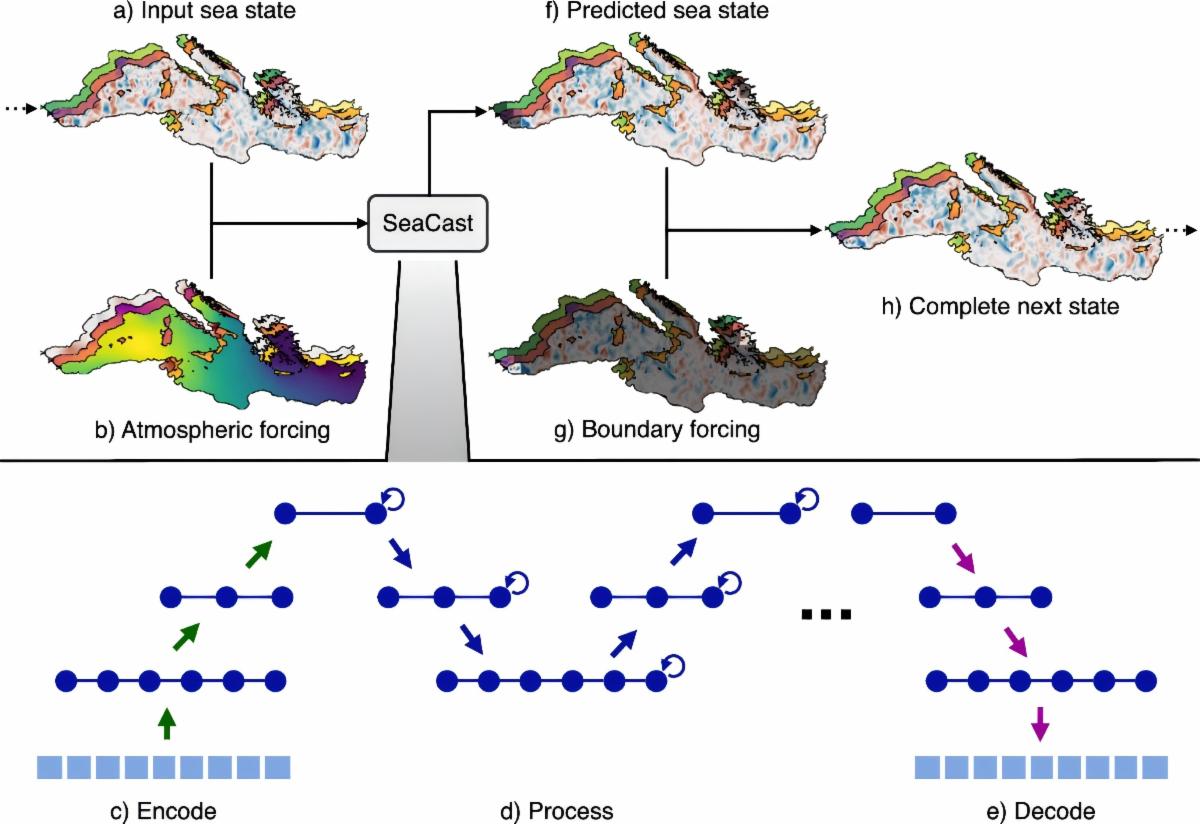 | Figure 2. SeaCast performs autoregressive ocean forecasting using a graph neural network (GNN). (a) The input sea state and (b) atmospheric forcing are projected onto a coarser mesh representation through the (c) encoder. (d) GNN layers process this latent representation on a hierarchical mesh. The output is then (e) decoded back onto the original grid to form (f) a predicted sea state. (g) Boundary conditions (here exaggerated in size) are incorporated to produce (h) the complete next state. This forecast is then fed back into the system as a new input (as shown by the arrow looping from h to a), enabling multi-step forecasting through repeated application of the encode–process–decode cycle. | | Nonlinear increase of Greenland Ice Sheet runoff into Disko Bay | | |