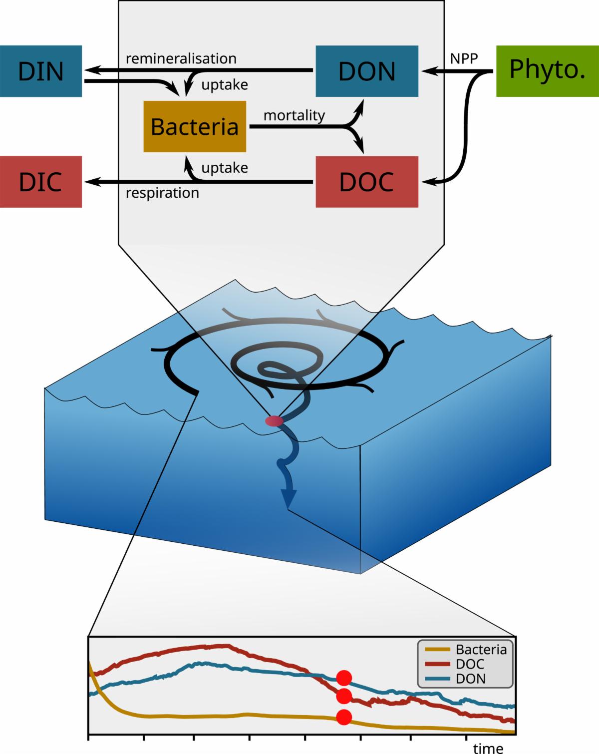| | Figure 7. Conceptual scheme of the microbial-DOM interaction model, predicting bacterial biomass, dissolved organic carbon and DON concentrations subjected to conditions along a Lagrangian trajectory into the North Atlantic Subtropical gyre. | |