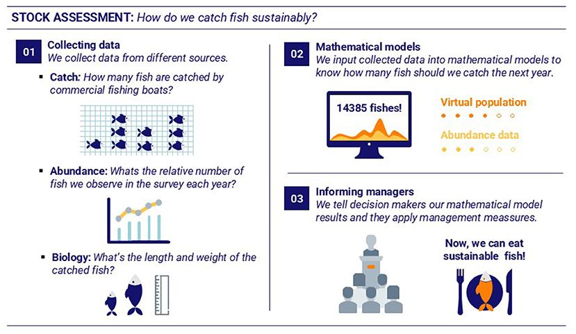 | | Figure 8. In step 1 of a stock assessment, scientists collect data on fish caught by commercial fishing boats, such as how many fish were caught and the length and width of each fish. In step 2, they enter the data into computer models that can estimate fish populations (the dots represent model results) and figure out how many fish should be caught the next year. In step 3, scientists give decision makers advice based on the results of the model, to help set fishing rules and keep fish populations healthy. | | Events, Webinars and Conferences | | |