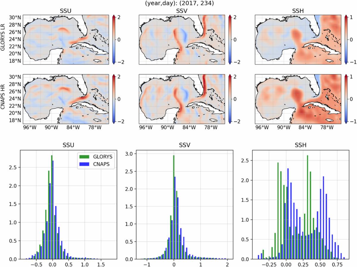 | | Figure 2. Example snapshot for GLORYS low-resolution and CNAPS high-resolution states, for SSH, SSU, and SSV, for a single time. Large scale structures are similar, but there are differences between the fields between each of the reanalysis products. Below, distributions for GLORYS LR and CNAPS HR data sets, for SSH, SSU, and SSV. | |