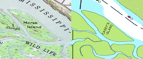 The USGS topographic map (above) uses the name Morse Island for the same feature that the U.S. Army Corps of Engineers map (right) calls Casey's Island. The BGN works with federal agencies to avoid such conflicts and approves a single name for use on all federal products.
