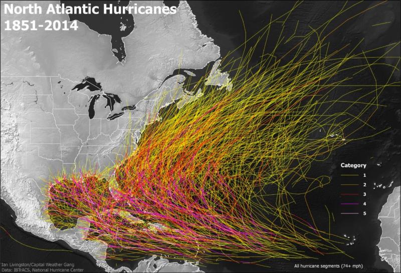 Hurricane segments of all storms in the Atlantic Ocean from 1851 - 2014. The Pacific Ocean straggler was Irene in the Atlantic Ocean to start, back in 1971. Colors are stacked from category 1 through category 5 here to highlight the most intense activity.