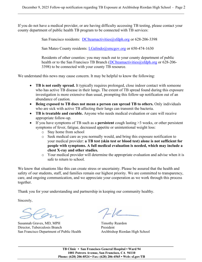 At his point, no additional active cases of tuberculosis have been identified. However, there have been enough cases of latent TB infection that, out of an abundance of caution, SFDPH is requiring that all students be tested.