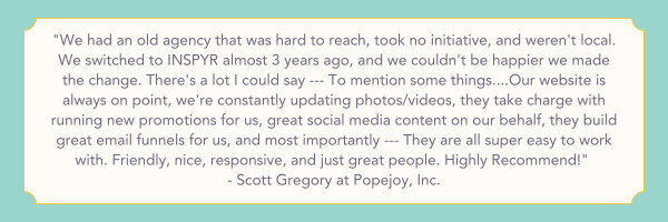 At INSPYR, we offer social media management & advertising, traditional media buying & advertising, creative marketing, and digital marketing. Now is the time to start planning for 2025 so if you aren't sure what marketing strategy you want to use in the coming year or just want to have a conversation about marketing for your business, reach out to us and schedule your free consultation!