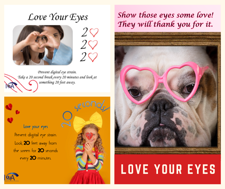 In celebration of Valentine's Day, the IOA is launching a Love Your Eyes campaign which encourages patients to practice the 20-20-20 rule. IOA members have access to resources like the graphics linked below and a customizable email template to send to your patients encouraging them to give their eyes a break when using digital devices and schedule a comprehensive eye exam.