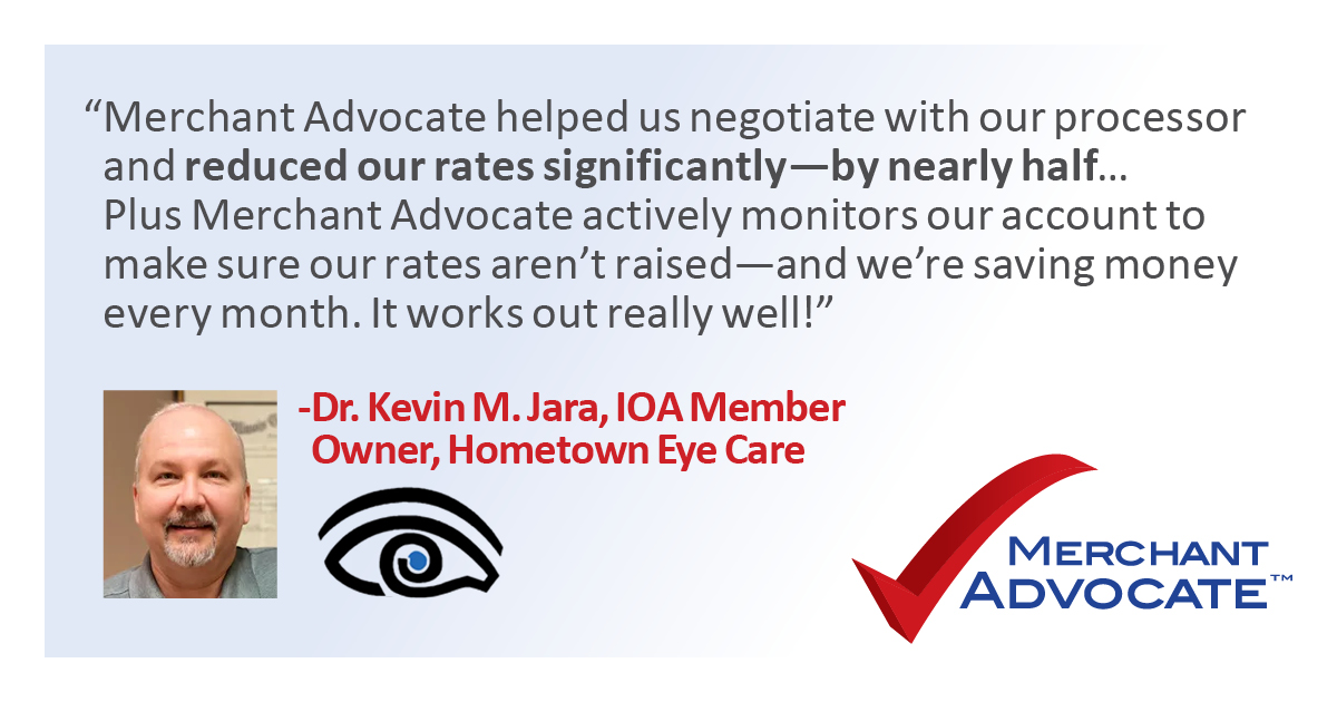 Merchant Advocate is an expert in navigating the processing industry, saving you money by exposing hidden fees, reducing rates, and optimizing setup. Whether advising on virtual payment costs, software integration challenges, or in the handling of sensitive patient data, Merchant Advocate helps eye care practices, and the Illinois Optometric Association, save without switching processors.