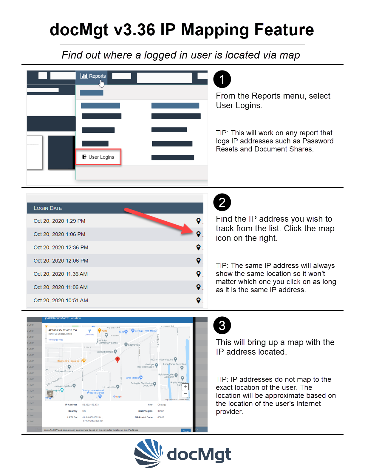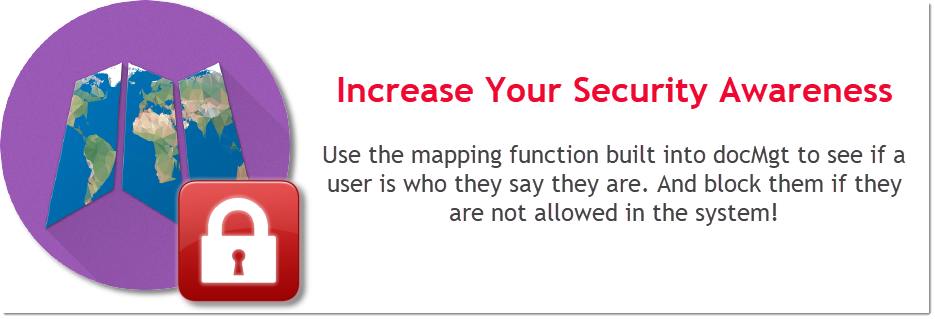 docMgt version 3.36 has added the capability to see from where users are logging in. In this release we upgraded our maps to use embedded Google maps which give more detail and are more interactive.