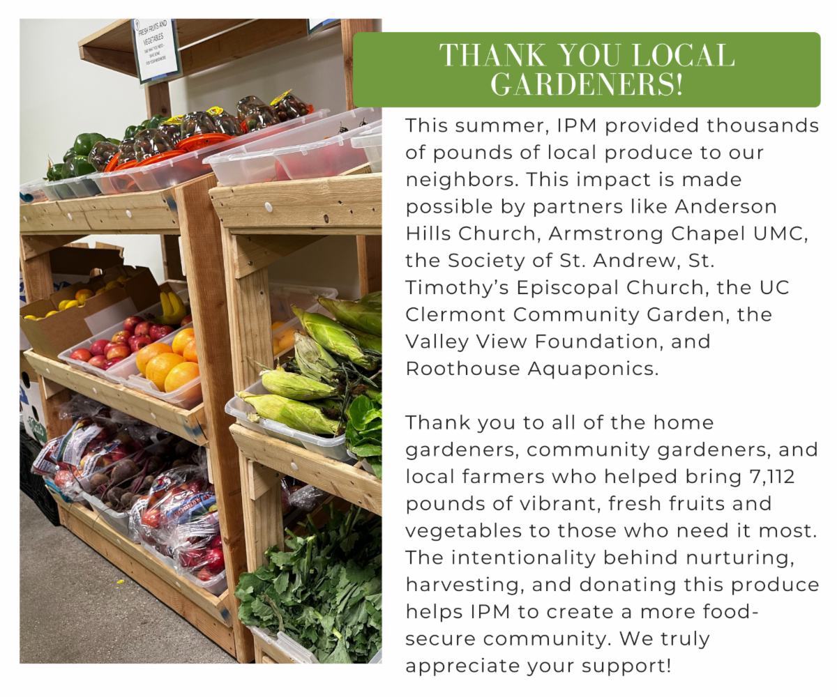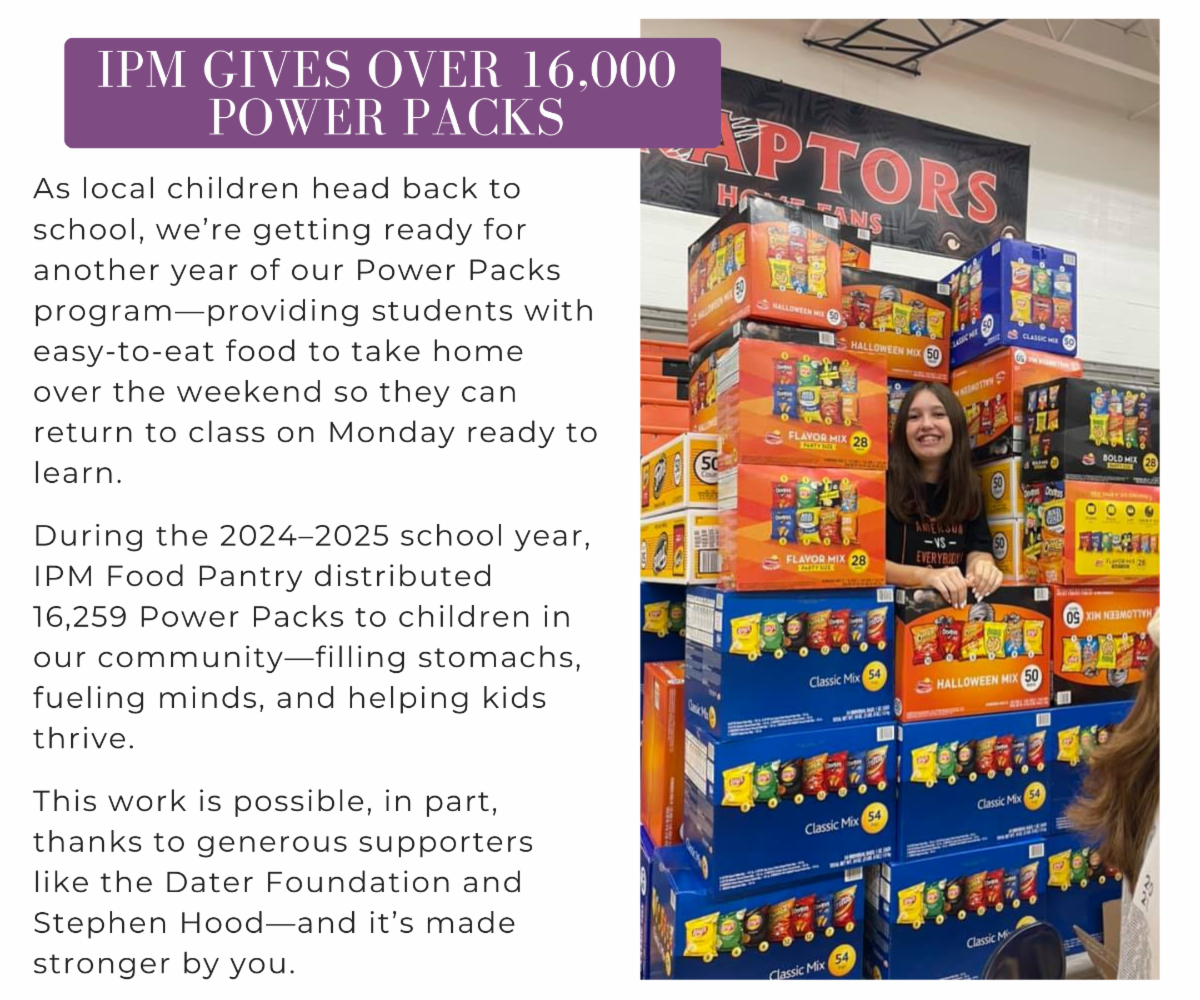 There is a growing need in our community, and together we can support families experiencing food insecurity. In 2024, IPM saw a 44% increase in total pounds of food distributed and a 45% increase in the number of zip codes we served. So far in 2025, IPM has recorded 74,062 individual visits and has distributed 1,386,769 pounds of food. Respectively, this reflects a 7 percent increase in individual visits and an 11 percent increase in the total pounds of food distributed over the same period of time in 2024.
