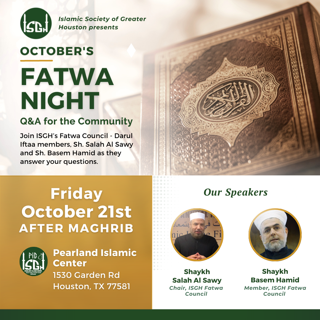 Join ISGH's Fatwa Council - Darul Iftaa members, Sh. Salah Al Sawy and Sh. Basem Hamid as they answer your questions.