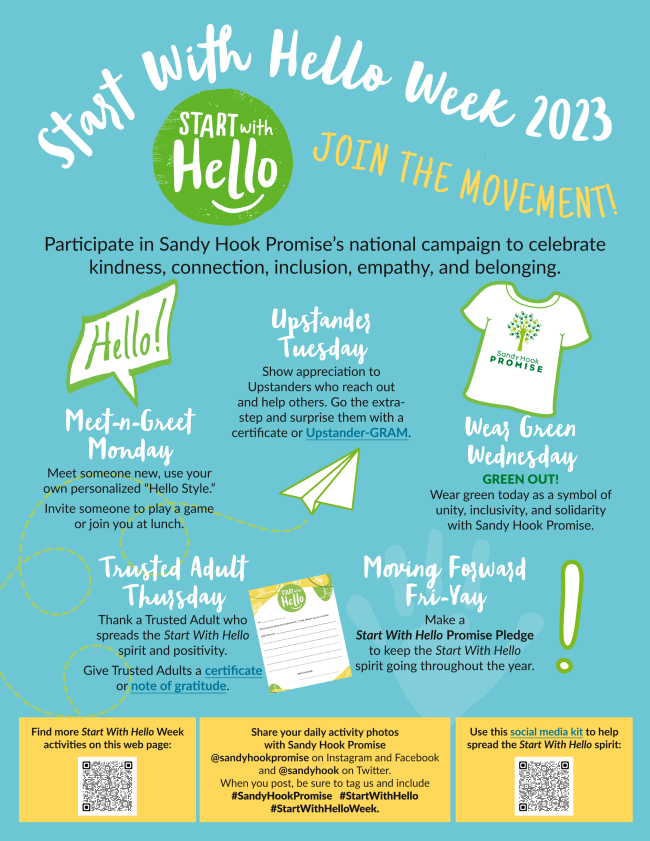 ISNP K-12 is celebrating Start with Hello Week this week. Start with Hello is an initiative created by the Sandy Hook Promise Organization and is a national awareness campaign dedicated to creating a sense of belonging among youth. It is "a call-to-action event for schools and youth organizations to commit to kindness, inclusion, and to empowering youth to make new social connections." The ISNP Upper Campus Guidance Department has created a schedule of daily events for our students and staff to engage in (see flyer below). We look forward to the week ahead and to these activities as we continue working to make all of our students feel welcome, comfortable, safe and supported at ISNP! You can learn more about Sandy Hook Promise by following the link available here.