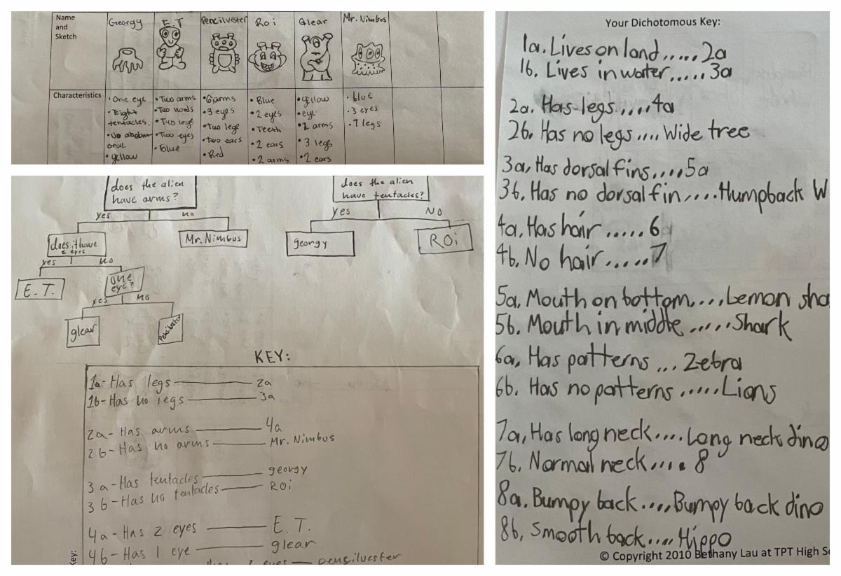 This week in Mrs. Boucher's Zoology class, students learned about dichotomous keys- a tool that scientists can use to help identify the scientific name of various species based on their physical characteristics. After learning how to use a dichotomous key, students were challenged to create their own dichotomous keys using either plastic plants and animals or plastic aliens. They collected information on the organisms' characteristics, and then created a flowchart of yes or no questions/statements that ultimately lead to each of the individual species' names. The flowchart is what they were able to convert into the numbered step dichotomous key.