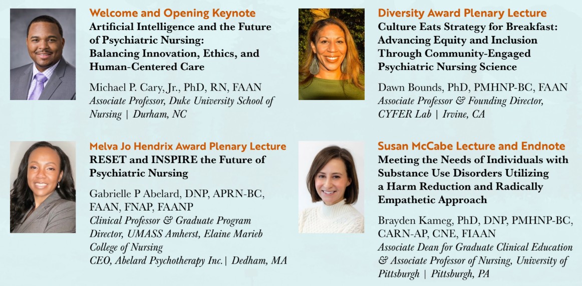 We are also excited to announce our featured speakers for the 2026 conference. This year’s keynote and endnote speakers are recognized leaders and experts in their fields, carefully selected in response to feedback from past conference evaluations highlighting the topics our members most valued. In addition, we are proud to present our two award plenary speakers, whose contributions to psychiatric-mental health nursing exemplify excellence and innovation. Together, these speakers will provide thought-provoking insights and inspiration as we explore the future of our profession.