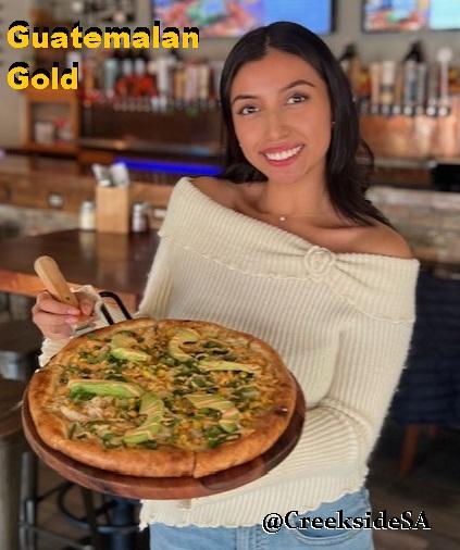 PIZZA of the MONTH: Gautemalan Gold | NEW: Pizza of the Month > GUATEMALAN GOLD, a spicy South American Masterpiece created by Creekside’s official South American ambassador, Soraya Reyes. Creamy ricotta cheese base sauce, light mozzarella cheese, shredded chicken, roasted sweet corn, fresh jalapeños, finished with sliced avocado, golden spicy ...CLICK TO READ MORE | | |