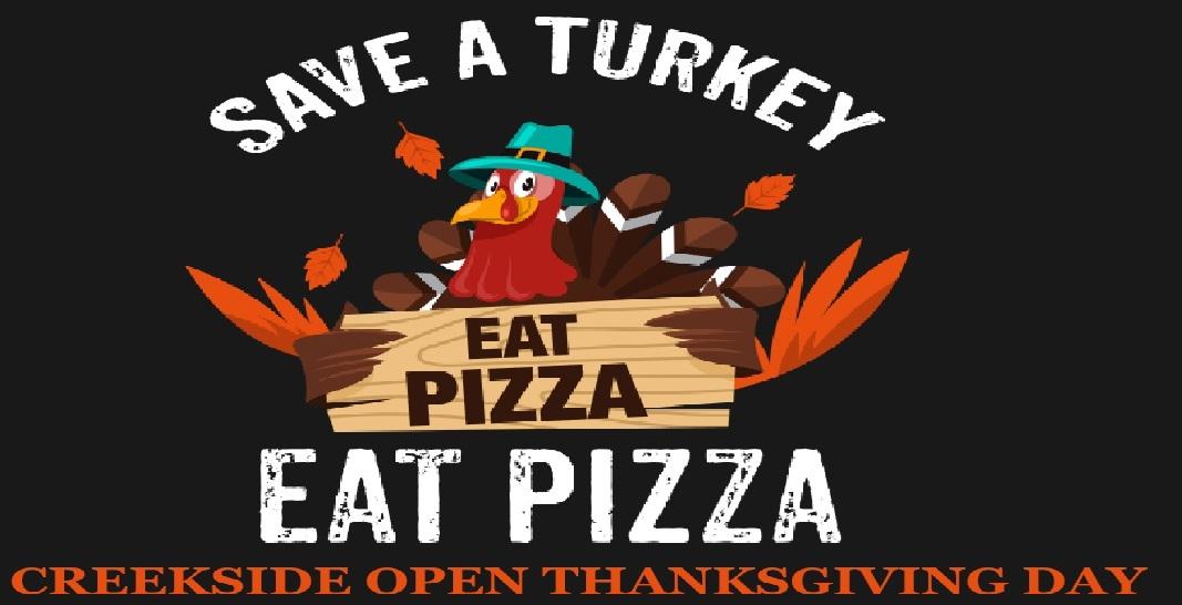 THANKSGIVING: Gather & Gobble at Creekside | Meet Friends and Family at Creekside on Thanksgiving Day from 12 Noon to 5PM. Creekside is open every day at 12 Noon, with Happy Hour at 4PM seven days a week, but we close at 5PM on Thanksgiving and Christmas Eve to give our hard working team members time with their families on these two days, the only two days we close early., but we are open 365 at 12 Noon Every Day @CreeksideSA | | |