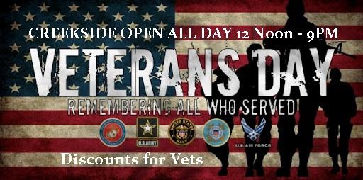 THANK A VET: Creekside Open Veterans' Day | Every Day, Creekside Honors the men and women of the US Armed Forces, our first responders, and community with respect, service, and gratitude. This week, Thank a US Veteran for their service. Creekside is open every day at 12 Noon, including this Veterans' Day. Let us Serve You. | | |