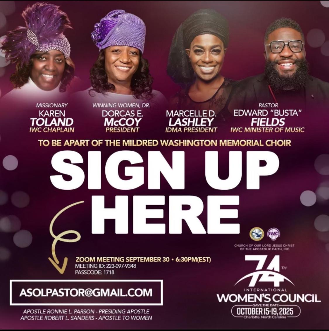 Join the IWC and the COOLJC Evangelism Department Tuesday, October 14, 2025 as we visit a family shelter, and Wednesday, October 15, 2025, for evangelistic outreach and prayer as we continue to spread the good news of the Gospel of Jesus Christ. We will meet in the lobby of the main hotel at 12:00 Noon Tuesday and 10:00 AM Wednesday for pre-evangelism prayer and instructions before departure. We are fasting and praying for souls to be saved and baptized in Jesus’ Name. For more information, please contact Winning Woman VP Shirlene Stewart 803-605-7034; iwcvpstewart@gmail.com, or District Elder Dr. Homer Brown 321-698-8822; eldhrb@outlook.com.