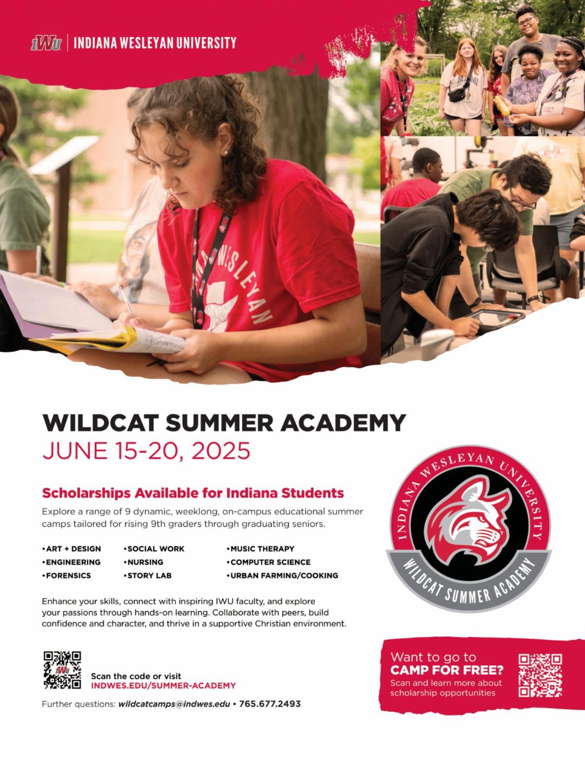 The Wildcat Summer Academy at Indiana Wesleyan University invites high school students (entering 9th grade to graduating seniors) to join an engaging, college-like experience on campus. Running June 15–20, 2025, this program fosters dynamic learning, spiritual growth, and meaningful social interactions in a supportive environment.