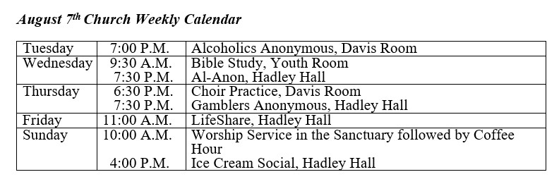 Church Summer Office hours: Monday, Wednesday, and Thursday 9:00am to Noon