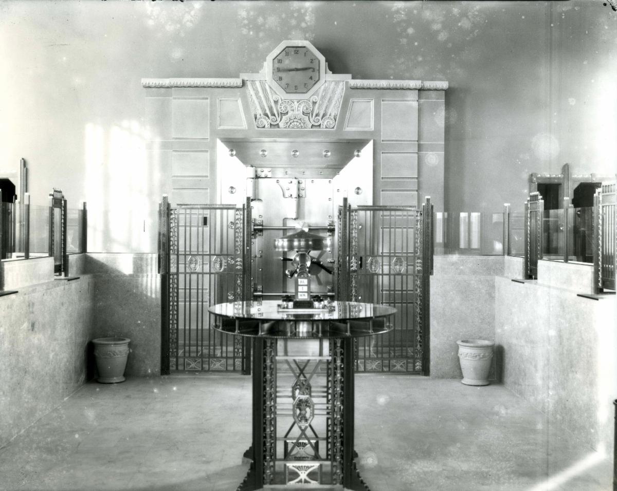 | Image: Malcolm Walter Collection, courtesy of Peerless Rockville | This interior photo of the Farmers Banking and Trust Co. building at 4 Courthouse Square shows the lobby as it appeared when the building opened in November of 1930. Montgomery History will soon be renovating the building which will open as the Montgomery County History Center later this year. This picture, from the Malcolm Walter Collection held by Peerless Rockville, was shared with us when we began researching the nearly-100-year history of the bank. At center can be seen a bespoke deposit slip/check-writing table, the design of which echoes the Art Deco architectural elements featured throughout the building. This table is no longer onsite, likely removed in the 1954 renovation of the lobby space along with the teller windows and the gates in front of the vault. We would love to be able to recover any of these elements from the original lobby. Do you or someone you know have clues as to the location of this table, or the other decorative elements in the photo? Please email us at info@montgomeryhistory.org if you have any information. | |