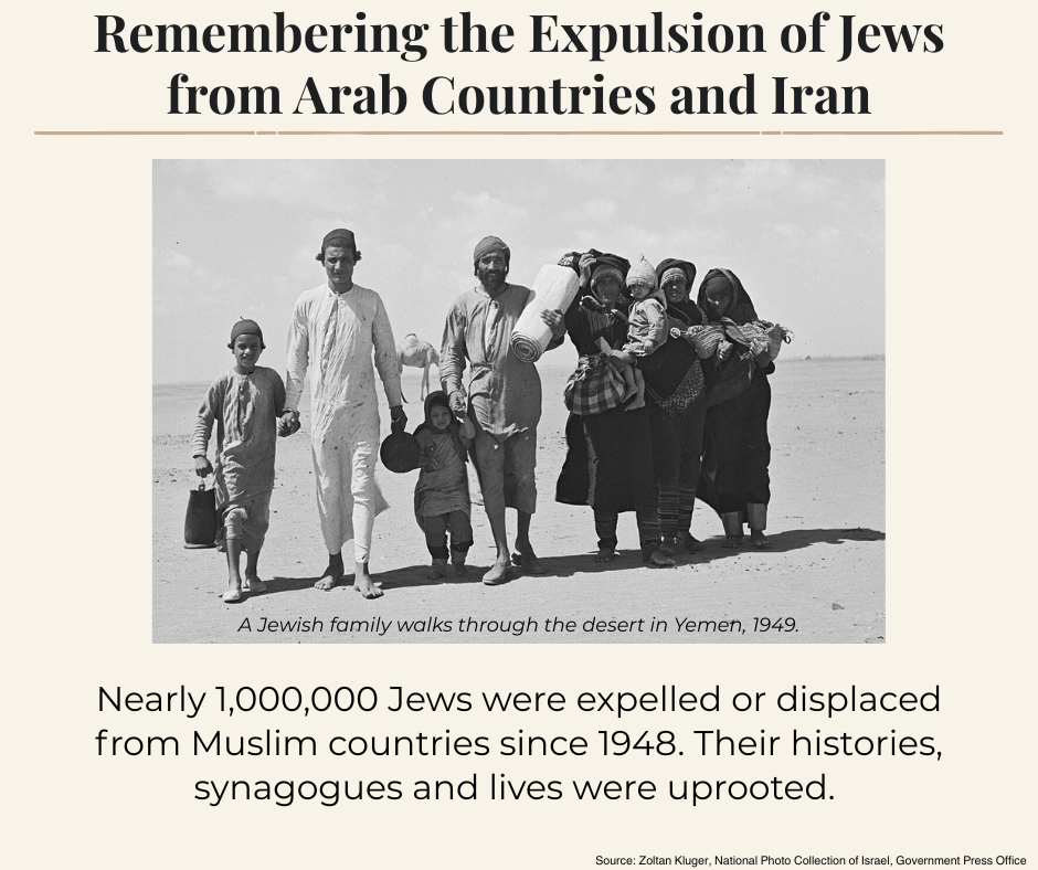 Jews are not strangers to the Middle East and North Africa, where their history dates back more than 4,000 years. The Romans, who conquered the area, enslaved or expelled most Jews from the Land of Israel 2,000 years later. Many Jews resettled in nearby countries and their communities lived across the region for centuries. Following the re-establishment of Israel in 1948, nearly one million Jews were expelled or forced to flee from Muslim countries. The false ‘colonizer’ accusation ignores this continuous presence and erases the experiences of Jews who were driven from their homeland.
