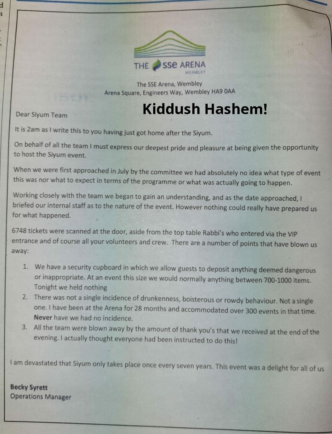 I am attaching a picture of a letter received from the venue utilized for the Siyum HaShas by our brethren “across the pond” in London.