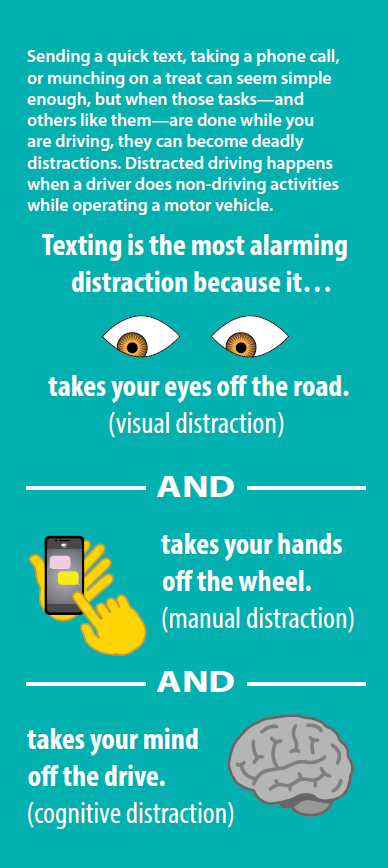 Distracted driving has become a deadly epidemic on our roads. Cell phone use — specifically, texting, talking, and social media use — has become the most common distraction. Other risky actions include adjusting the radio or GPS, applying makeup, eating and drinking. By driving distracted, you’re robbing yourself of seconds that you may need to avoid a close call or deadly crash.