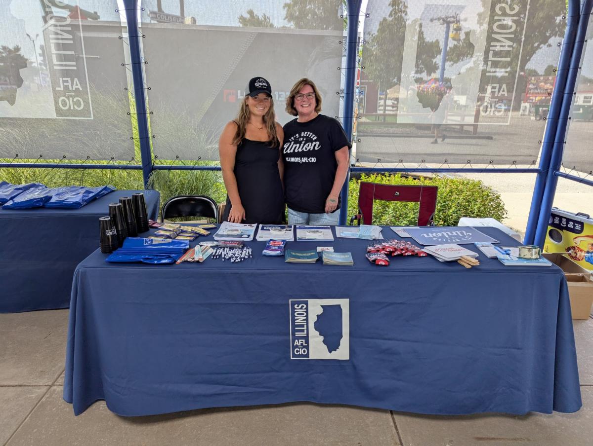 The labor pavilion, built in 1986, provided shade, cooling fans and a great place for members to meet up. This year’s activities included a “Union Day” on August 9th where union members were presented with a free goodie bag. Visitors could get their photo taken with the inflatable Mother Jones, drink from the ice-cold water fountain and take time to sit and rest.   |  |   | Illinois AFL-CIO Resource Director Amy Rueff and CLC Coordinator Carolyn Franke coordinated volunteers from 26 labor unions who worked 108 daily shifts. Volunteers greeted fairgoers while providing small gifts and sharing information on why it’s better in a union.