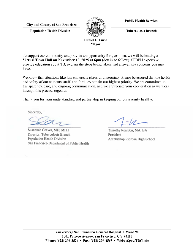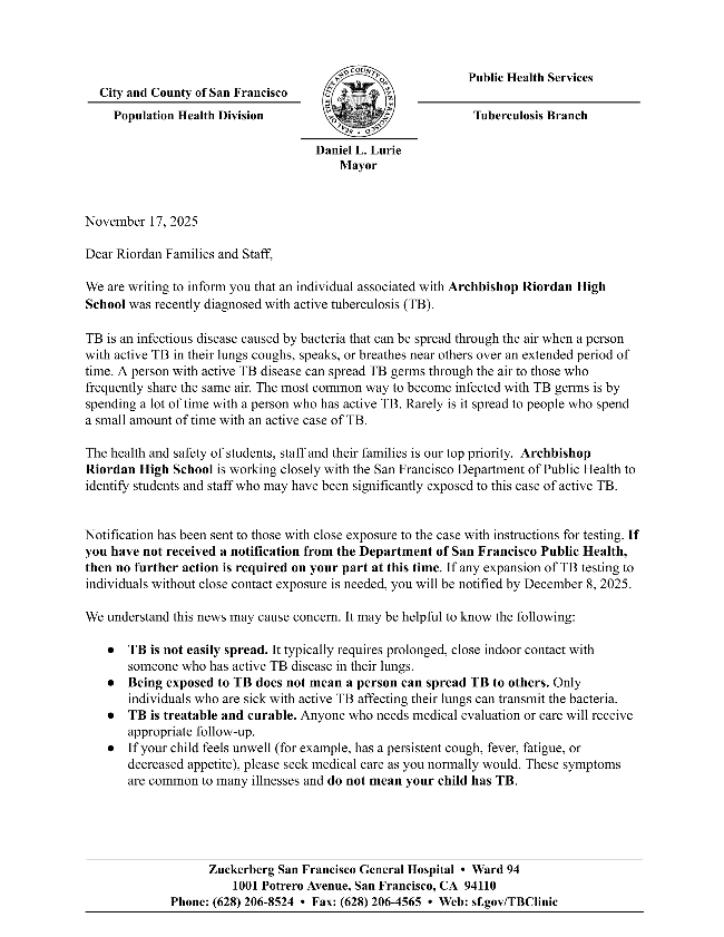 Please take a moment to read the notice below carefully and in full. The Riordan Administration is working closely with the Department of Public Health, and the information provided in the letter reflects all details we have to share. We remain confident that, in partnership with DPH, we are keeping our community informed and up to date.