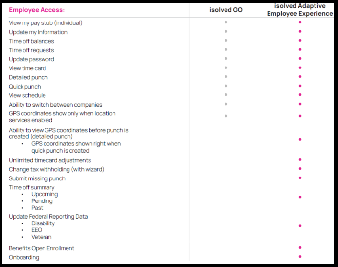 iSolved AEE is a more advanced platform than the iSolved Go mobile app and works across platforms. It can be accessed from a PC or a mobile device with no need to download a separate application. The chart below highlights the additional capabilities of iSolved AEE vs. iSolved Go: