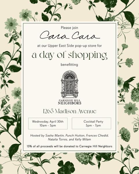 Please join Cara Cara at their Upper East Side pop-up store for a special day of shopping on April 30th from 10 AM - 5 PM in support of Carnegie Hill Neighbors—15% of all proceeds will be generously donated to CHN.