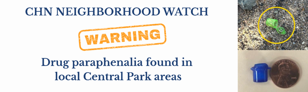 A Carnegie Hill resident reported to CHN that they saw vials and syringes “concentrated in one area by 102nd street on the path that leads to the Conservancy Gardens from the East Meadow by Mount Sinai, also scattered throughout the park, and on the sidewalk by the East 97th entrance.