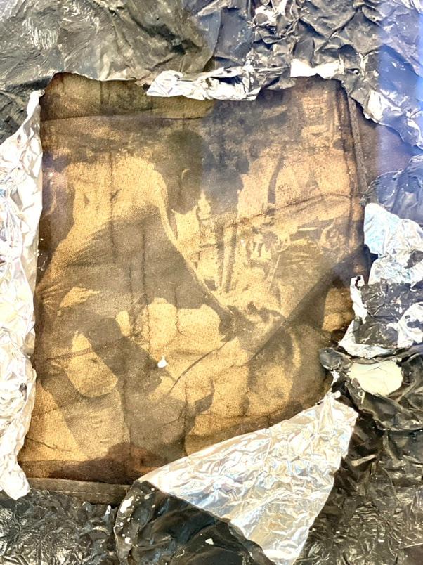 Jack Whitten, "Birmingham, 1964, Aluminum, newsprint, stocking, and oil on plywood