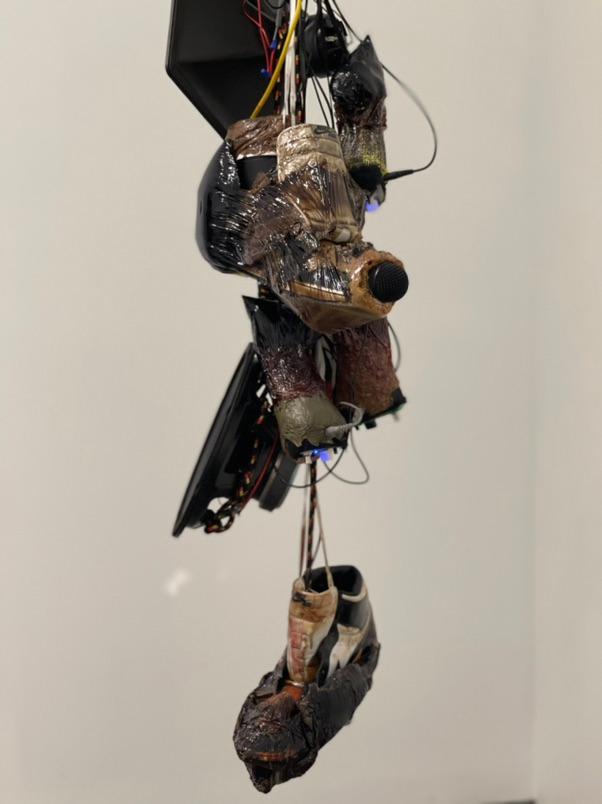 Kevin Beasley’s Strange Fruit, 2015, an installation featuring Nike Air Jordan 1 shoes in white and black with polyurethane resin, polyurethane foam, tube socks, shoelaces, rope, speakers, hyper cardioid and contact microphones, amplifier, patch cables ad effects processors.