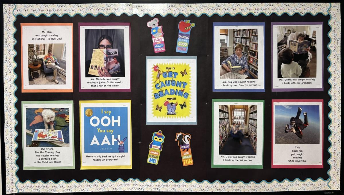 | | May is Get Caught Reading Month | | I spy photos of some library staffers getting caught reading on the Children's Room bulletin board! | | May is also Mental Health Awareness Month | | Check out these books about feelings, emotions, self-care, and more featured on our special book display and in our stacks. | | |